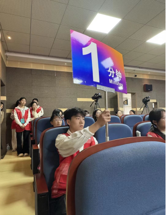 在比赛核心流程保障环节,PPT 组志愿者各尽其责、精准协同:一人专职操控双计时平台,默契协助选手完成 PPT 切换;另一人严守规则举牌提示剩余时间,为中英双语选手的陈述与答辩环节筑牢精准高效、公平公正的保障防线。成绩处理与闭幕式环节,现场组志愿者有序为评委递送证书,以细致服务护航赛事收官,让收尾环节尽显流畅与庄严。