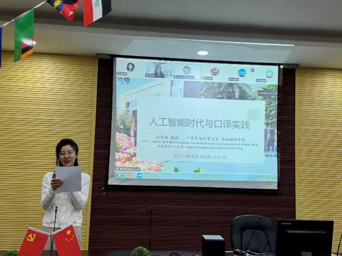 (通讯员:周晓威)2025年12月1日上午,由武汉工程大学研究生院与外语学院联合主办的研究生创新学术论坛顺利举行。本次讲座在文科楼117开展,特邀广东外语外贸大学高级翻译学院苏雯超教授作线上专题报告,题为“人工智能时代与口译实践”。讲座由外语学院周晓威老师主持,外语学院教师代表及研究生共同参与了本次学术活动。