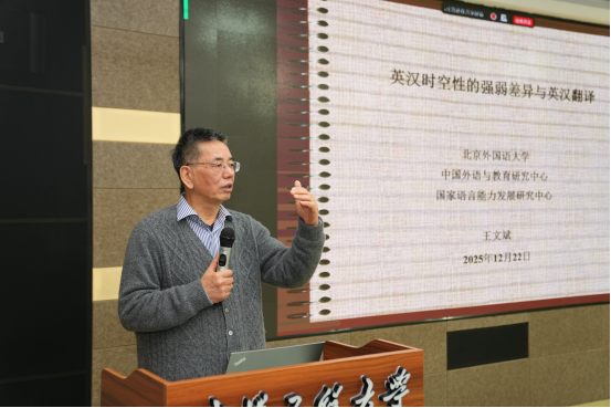 (通讯员:刘晨)2026年4月23日上午,北京外国语大学文科资深教授、博士生导师、国家社科基金语言学科组会议评审专家王文斌教授应邀在文科楼315会议室为我院师生做了题为“英汉时空性的强弱差异与英汉翻译”的学术讲座。本次讲座由外语学院副院长杨志主持,外语学院教师及研究生共同参与。