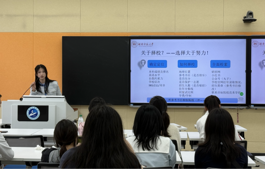 分享会上,上岸湖南师范大学的梁好以自身具体情况为切入点,详细拆解了考研全流程的备考要点。在择校环节,她强调“选择大于努力”,建议同学们结合本科成绩、英语水平、自我约束力等确定自身定位,从地理位置、参考书目等维度全面检索院校信息,尽早明确目标。