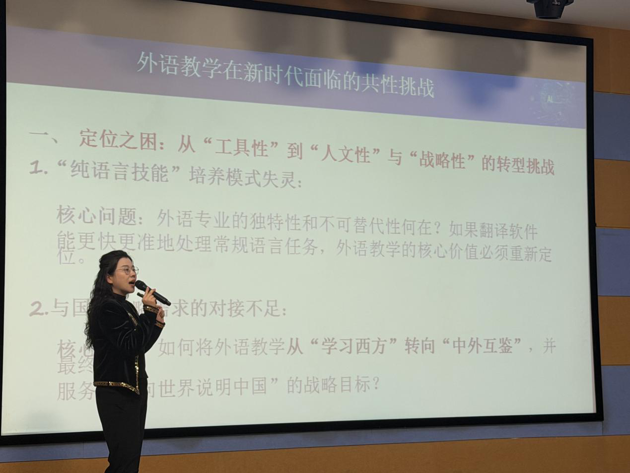 张薇薇教授开篇剖析了新时代外语教学的三大共性挑战:一是“定位之困”,AI翻译普及使传统“纯语言技能”培养模式失灵,需重新定位外语专业的独特性;二是“内容之困”,知识结构单一与“课程思政”融入难,制约“外语+”复合型人才培养。针对挑战,教授提出核心观点:“技术赋能人文,而非取代”,强调智慧课程的核心是培养批判性思维、文化理解等人文精神,技术作为深化传统人文教学方法的工具。