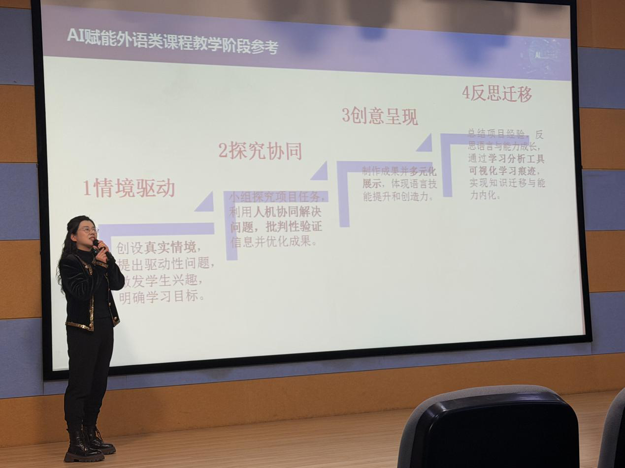 张薇薇教授分享了“情境驱动——探究协同——创意呈现——反思迁移”四阶段 AI 赋能外语教学流程。她强调,智慧课程设计要同时关注“逻辑线”和“情感线”两条主线。